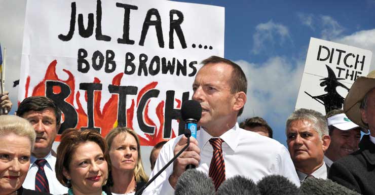 Tony Abbott’s appearance in front of signs that read “Ju-liar, Bob Browns [sic] Bitch” as Opposition Leader should have been a “career-ending moment for Tony Abbott”, former Prime Minister Julia Gillard said.