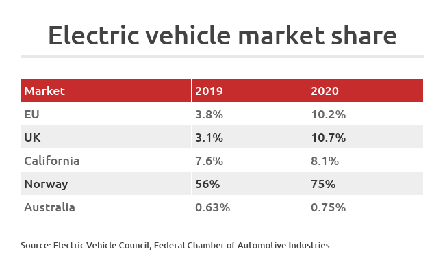 It comes after the Electric Vehicle Council released data earlier this month showing that electric cars accounted for just 0.75 per cent of total cars sold in Australia in 2020, compared to 75 per cent of total cars sold in Norway, and 8.1 per cent of total cars sold in California.