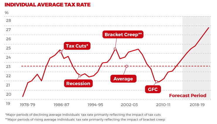 Tax modelling data released by Treasurer Scott Morrison shows that average income tax rates are forecast to rise by around 3 per cent over the next three years as a result of bracket creep, whereby higher wages push individuals from one tax level to the next.