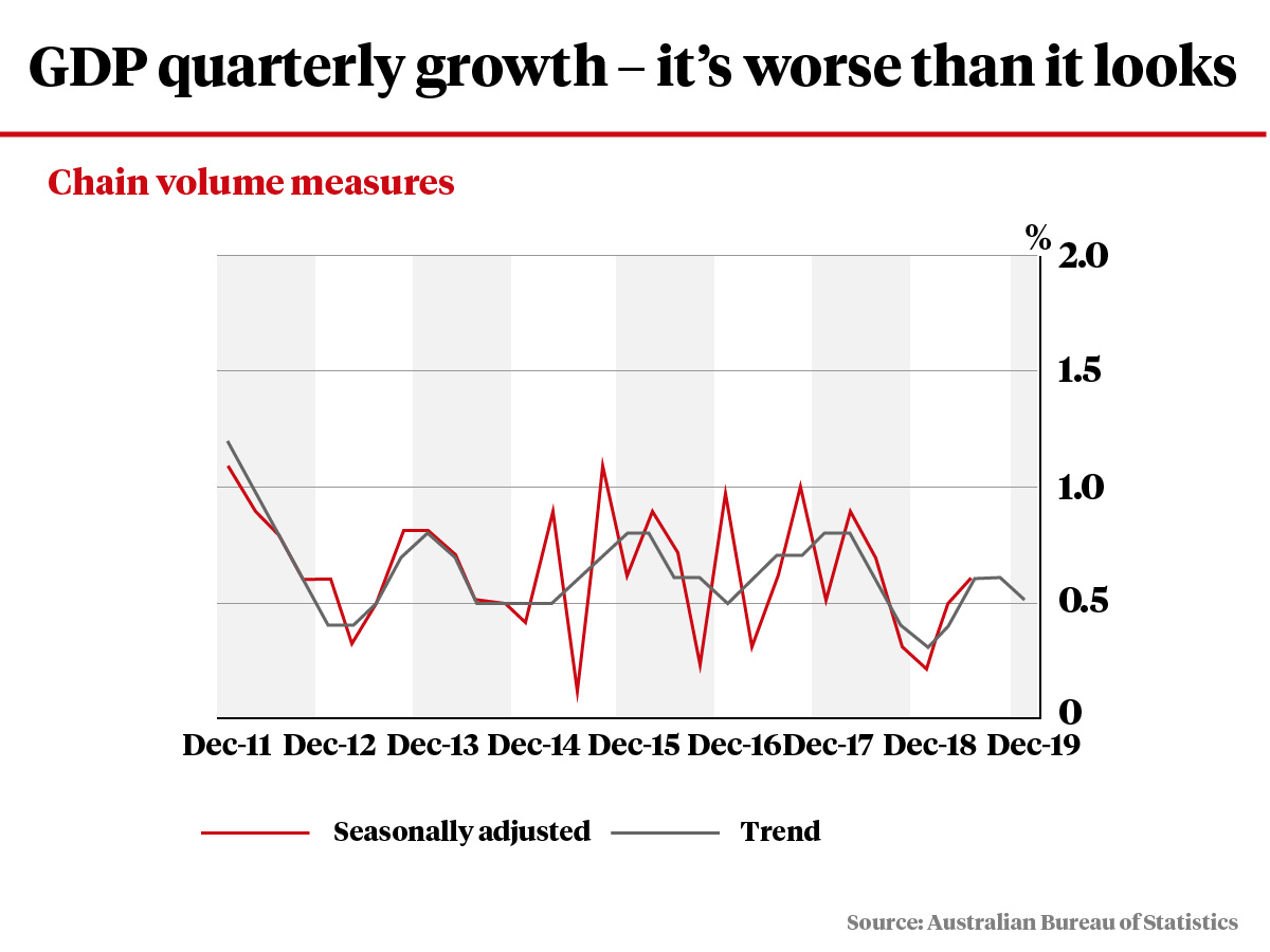 Yes, 0.5 per cent looks better than the 0.3 per cent that was feared, but the difference between those two numbers came down to a rise in inventories, which the Australian Bureau of Statistics’ national accounts treat as a positive.