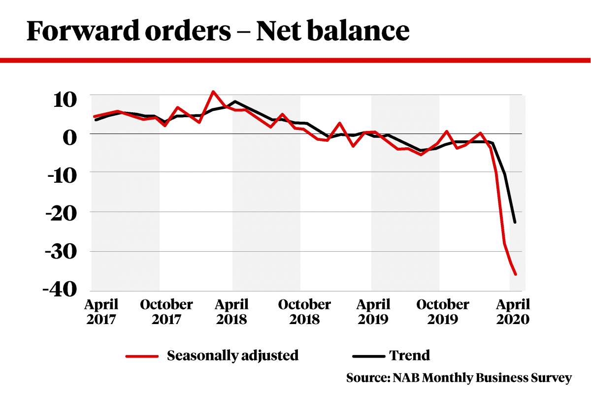 The NAB business conditions index plunged to minus 22 in March and fell further last month to minus 34.