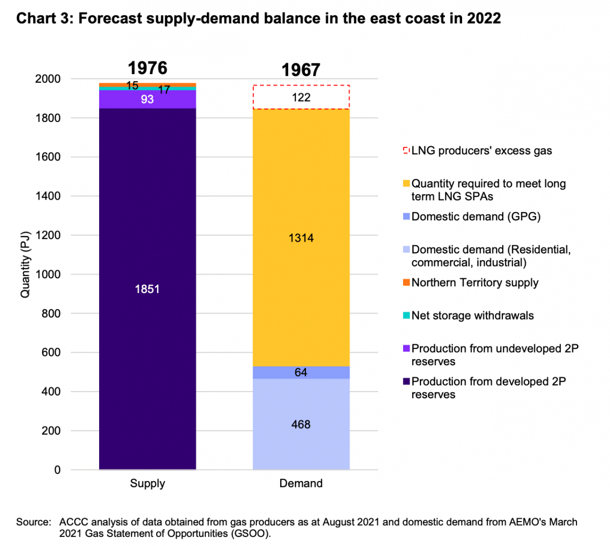 ACCC data shows producers have an extra 122 petajoules (PJ) of gas in 2022 they could supply to the local market rather than exporting it.