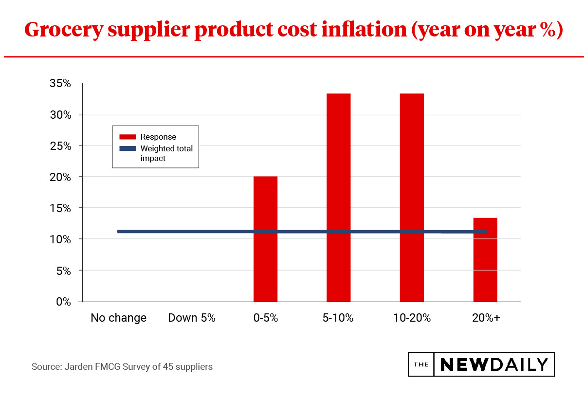 A survey of supermarket suppliers conducted by Jarden in January found 90 per cent planned to raise prices this year after facing an average 11.3 per cent increase in costs, again largely due to supply-chain pressures and wages.