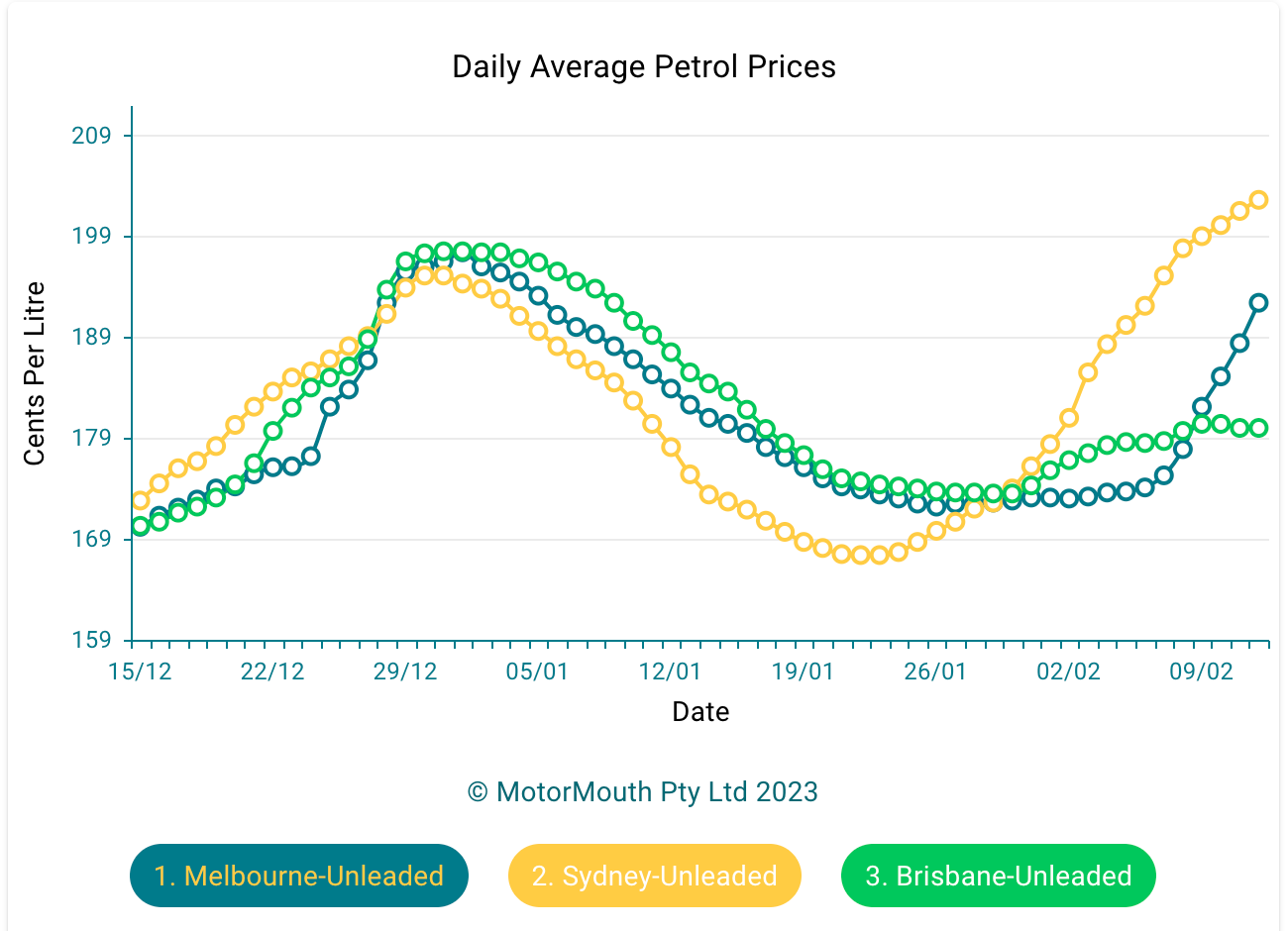 Bowsers have reached 192 cpl in Melbourne and 180 cpl in Brisbane, according to MotorMouth, capping off a three-week series of hikes that have seen prices across the major capital cities rise 10 per cent.