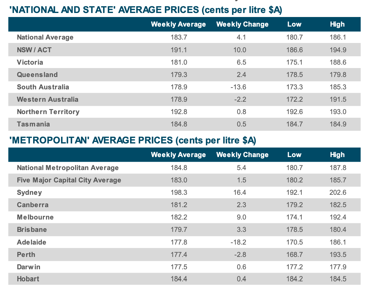 National average petrol prices rose 4.1 cents last week to 183.7 cents per litre (cpl) to be well above the three-month average, according to data from the Australian Institute of Petroleum (AIP) published on Monday.