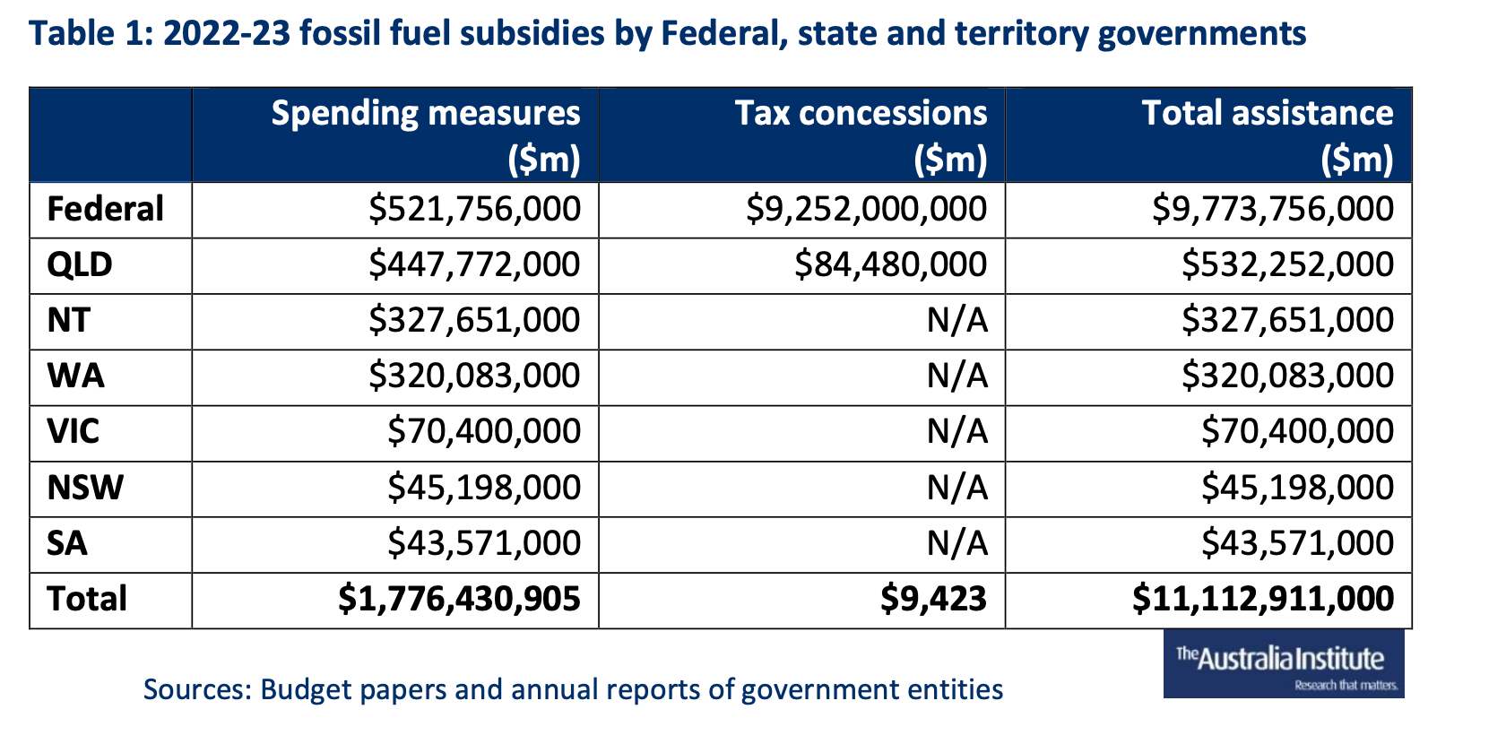 Prominent examples of federal fossil fuel handouts identified in the report include a $1.9 billion plan to support a petrochemical hub in Darwin and $141 million for carbon capture and storage.