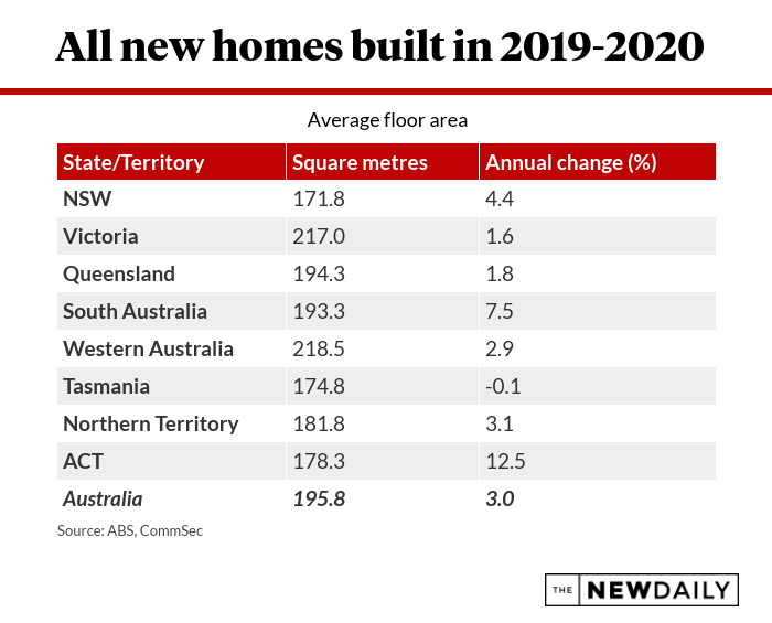 The stockbroking arm of Commonwealth Bank released new research on Monday showing the average size of a new house built in 2019-20 was 2.9 per cent larger than the previous year.