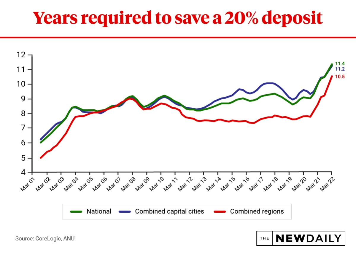 The time it takes to save a deposit rose at the fastest rate on record during COVID-19, CoreLogic and ANZ Bank said on Thursday, with the median measure of the time taken to save for a mortgage reaching an astonishing 11.4 years.