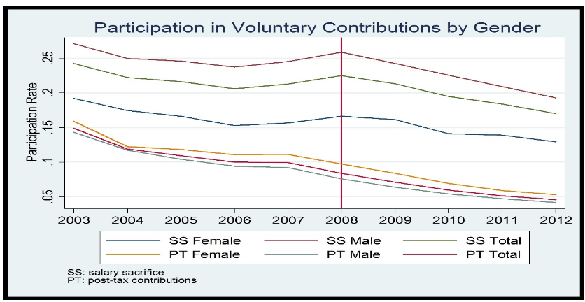 Interestingly, while the percentage of women making voluntary contributions has also declined, the percentage of women making such voluntary contributions is actually higher than for men.