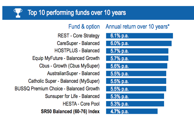 The top 10 performing funds over this period are dominated by industry funds, with REST topping the leaderboard with an average annual return of 6.1 per cent, followed closely by CareSuper’s balanced fund, which has returned 6.0 per cent annually on average over the decade. All the top 10 comfortably exceeded SuperRatings’ industry benchmark of 4.7 per cent target, the group found.