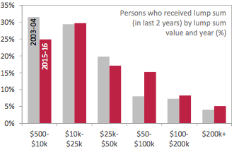 While the percentage of super taken in lump sum payouts has declined from 75 per cent in 1994, the size of super balances has grown dramatically since then, so the actual dollar amount taken in lump sums is much larger now.