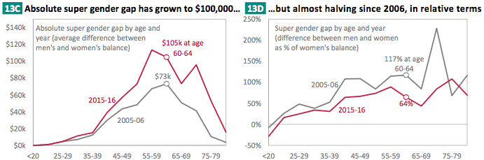 While the gender gap in super savings has expanded to $105,000, it had almost halved in real terms since 2006, the survey found: “In 2016, women’s balances at age 60-64 were 64 per cent lower than men’s; down from 117 per cent 10 years earlier.”