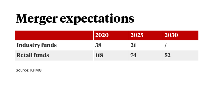 “By 2030 retail fund numbers will be down 66 per cent to 52,” KPMG said, as regulatory and economic pressures put mergers high on super trustee boards’ agendas.