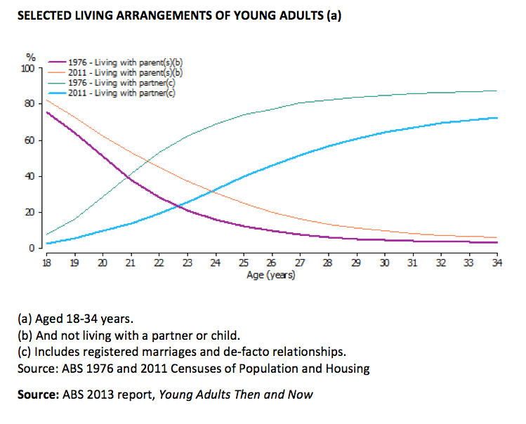 A 2013 ABS report, Young Adults Then and Now, also found that those aged 18-34 much more likely to live at home with their parents than in 1976 – up from two in ten to almost three in ten.