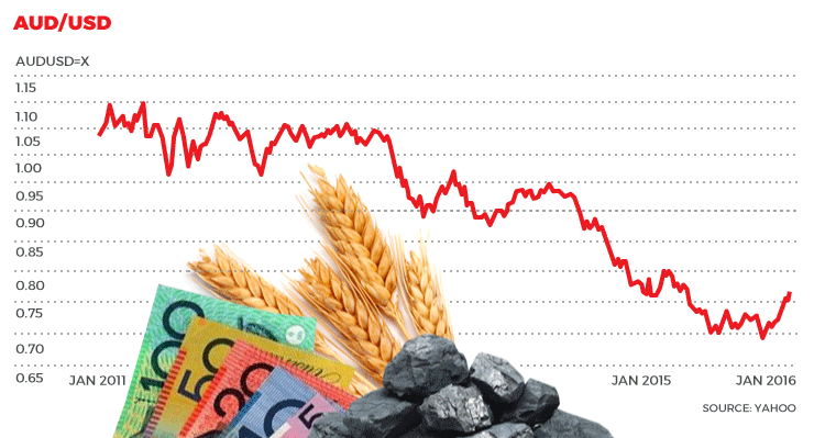 As the above graph shows, these have really tanked since mid-2014. The currency has followed suit as buyers of iron ore and dairy products needed less of the Aussie to supply their needs.