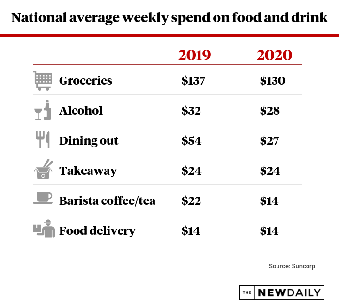 Australians also sliced their weekly restaurant bills in half – from $54 to $27 in 12 months – but both takeaway and food delivery spending held firm.