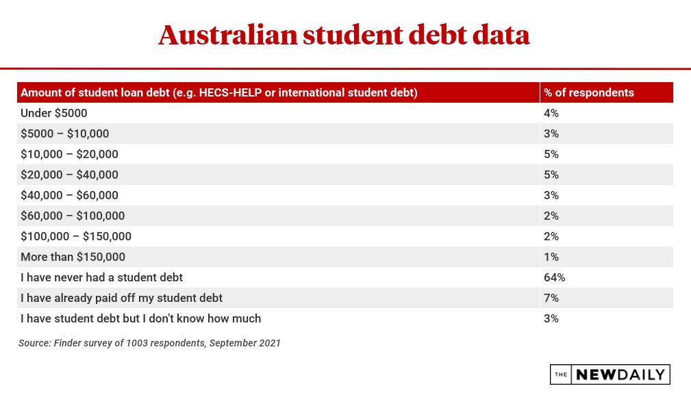 New data from Finder shows 28 per cent of Australians have student loans, ranging from less than $5000 to more than $100,000.