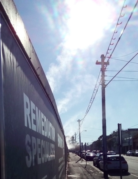 The site of the old gasometer, a field of toxins leached into the soil, is being cleansed. Along the fence is a row of plumes blowing away the unpleasantness. Is it a mist of water dampening the dust and discouraging escape or is it the smoke of an underground peat fire?