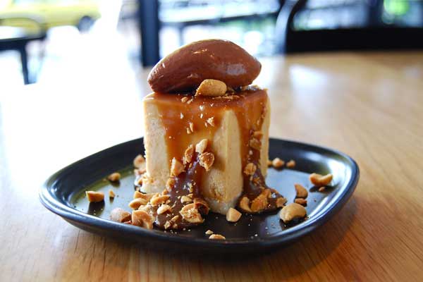 A caramel cloak flows over the delicate cube of icy peanut butter parfait, which arrives punctuated with peanuts and christened with a quenelle of rich chocolate mousse.