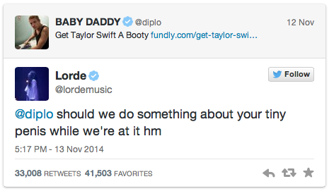 Lorde was quick to defend her friend of more than a year, tweeting back a scathing insult about Diplo’s private parts.