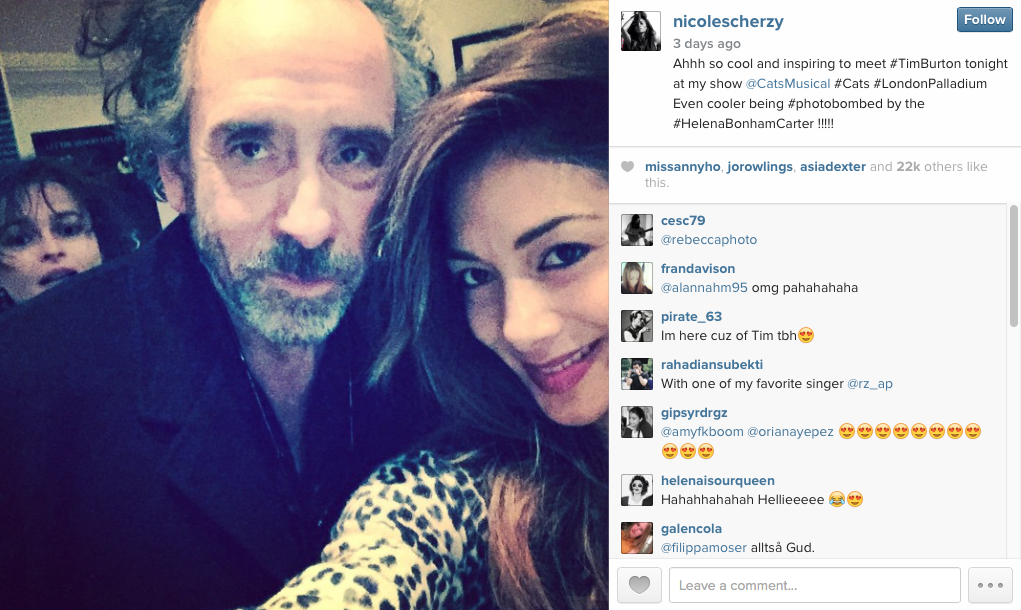 Burton, 56, and Bonham Carter, 48, were last spotted together on Saturday, when singer Nicole Scherzinger posted a photo of the pair visiting her backstage after a Cats broadway show on Instagram.