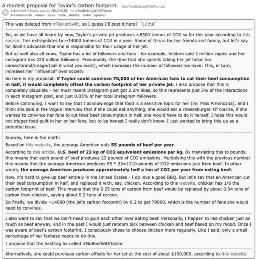 ‘‘If Taylor could convince 70,000 of her American fans to cut their beef consumption in half, it would completely offset the carbon footprint of her private jet,’’ the now-deleted post read.
