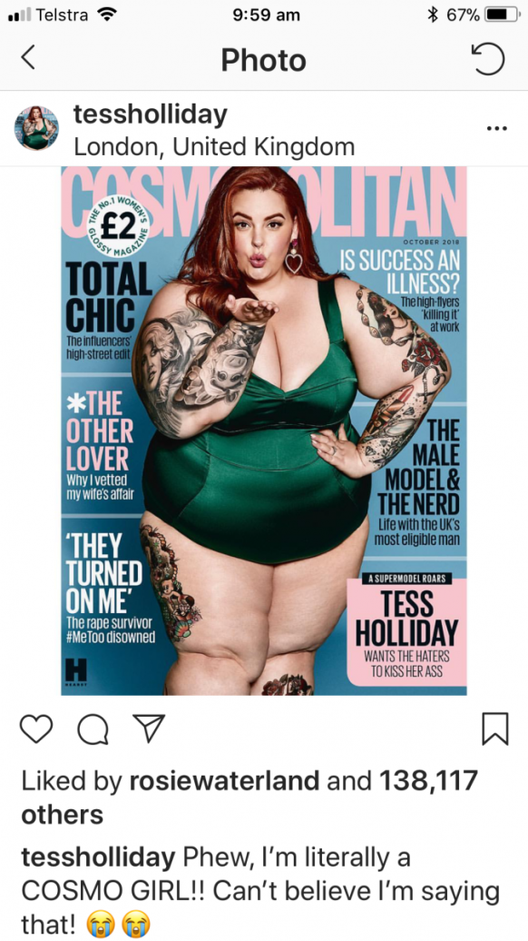 There was much talk this week in every corner of the media about the new issue of UK Cosmopolitan magazine which features the high-profile model, blogger and body-positive activist Tess Holliday in a swimsuit.
