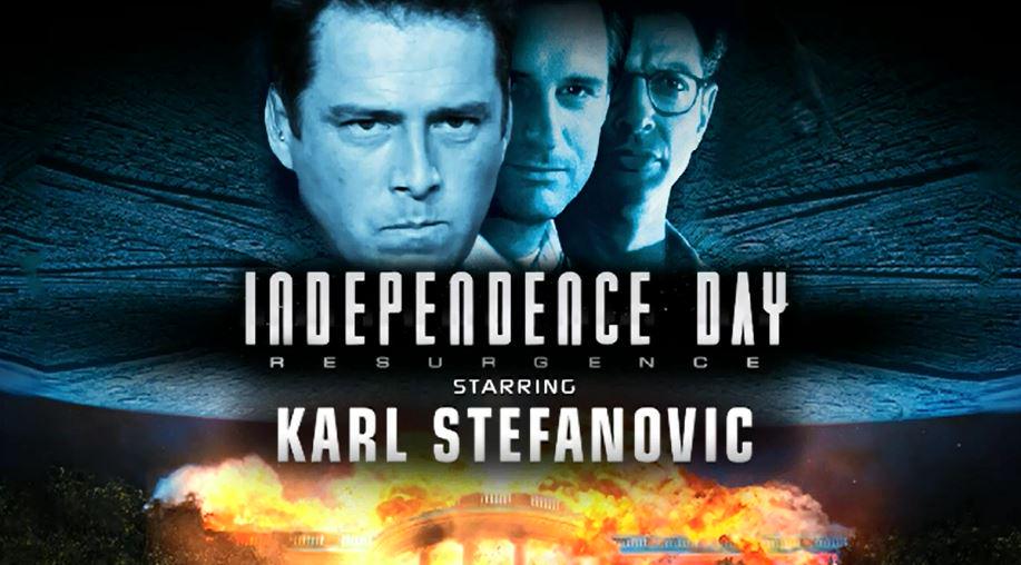 Australia’s Karl Stefanovic may get some screen time in the new Independence Day movie as a “dodgy TV host” after filming a speaking part in the production.