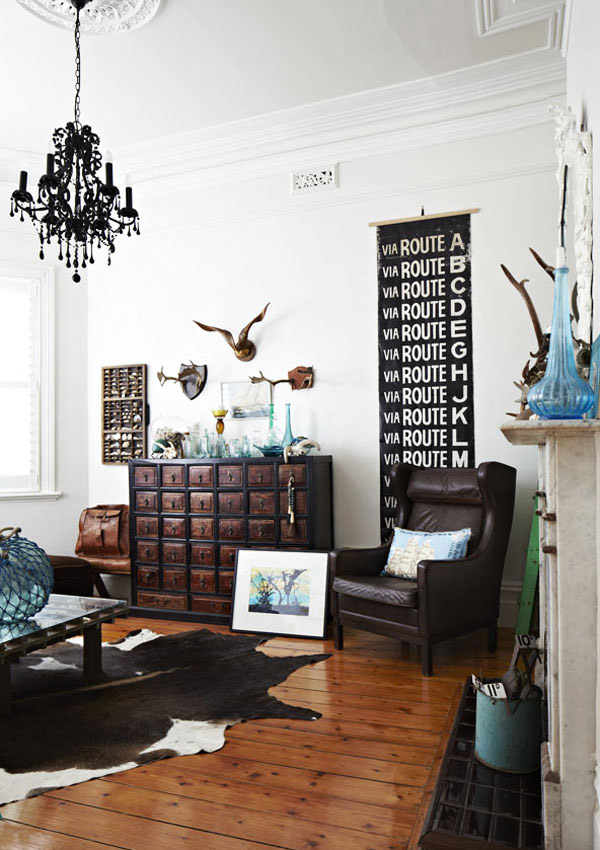 A carefully curated combination of vintage market makes a strong statement in this front sitting room. Head to a local craft market to unearth similar treasures of your own. Choose a feature light in a contrasting colour to pack a stylish punch, and consider an inexpensive cowhide for practicality and shape on the floor. Glass collections also make an effective and colourful vignette.