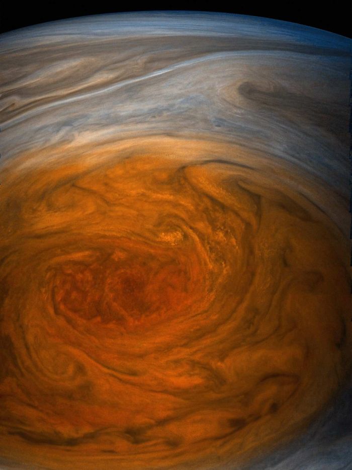 Travelling at about 50 kilometres per second, Juno flew within 9000 kilometres of the billowing brick-red cloud tops of the hurricane, which has been raging for at least 200 years.