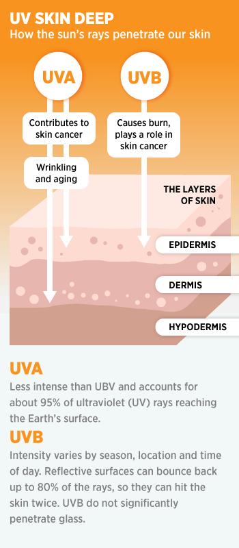 Look for “broad-spectrum” on the label, as this indicates the sunscreen protects against both UVA and UVB. UVA causes ageing and wrinkles and contributes to skin cancer, while sunburn is caused by UVB rays, which also play a key role in developing skin cancer.