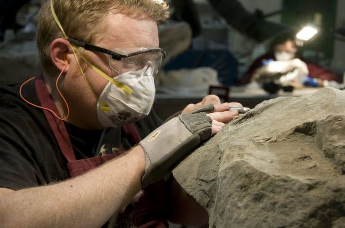 The creature, from a family of armoured beasts known as “nodosaurs”, was named after museum technician Mark Mitchell, who spent more than 7000 hours on the painstaking work.