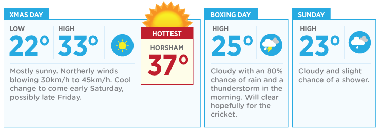 Although there is an 80 per cent and 50 per cent chance of a downpour on Boxing Day and the next day respectively.