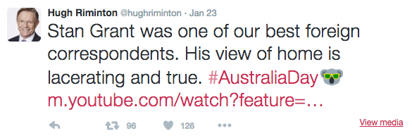 Grant has received praise online, including from journalists Hugh Riminton and Fran Kelly, as well as Mike Carlton who described it as a “Martin Luther King moment” on Twitter.