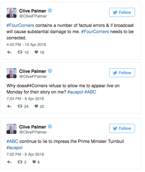 Four Corners replied the program format did not allow for on-air interviews, although they had repeatedly contacted him for a pre-recorded chat. Mr Palmer’s appearance on Lateline was announced on Monday afternoon.