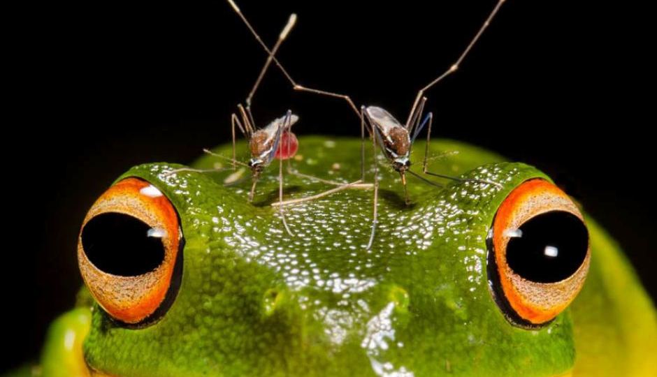“With my headlamp light failing I managed to take just one photo of uranotaenia mosquitoes, also affectionately known as ‘frog flies’ happily feeding from a frog’s head.