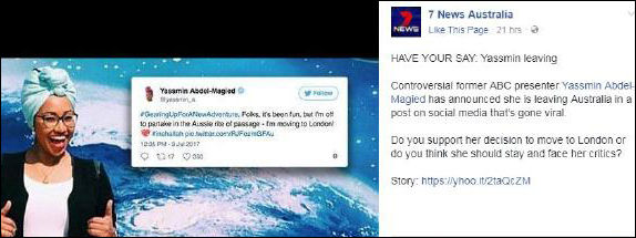 In a recent Facebook post, 7 News Australia questioned its followers as to whether Ms Abdel-Magied should stay in Australia to “face her critics”.