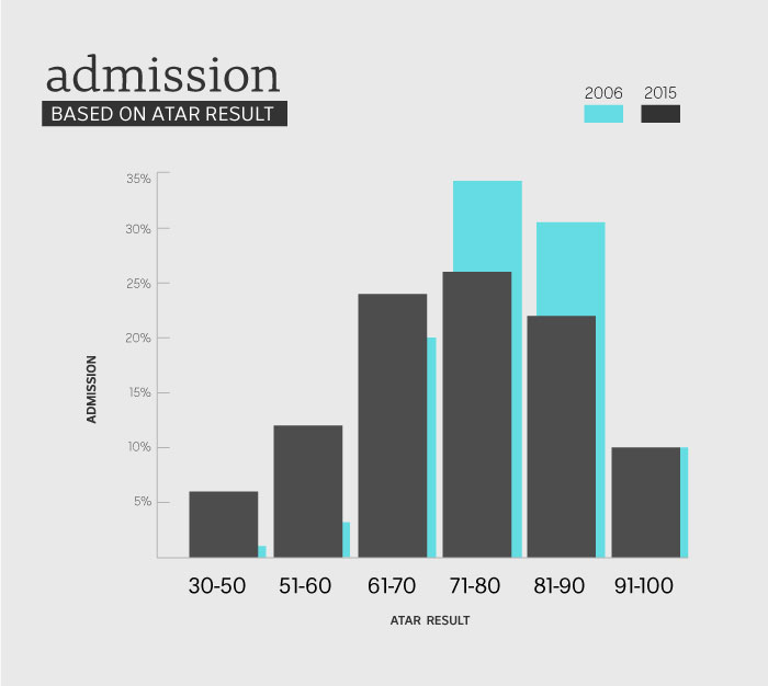The number of teaching students who scored an ATAR lower than 70 has surged over the past decade, going from 25 per cent in 2006 to 42 per cent in 2015.