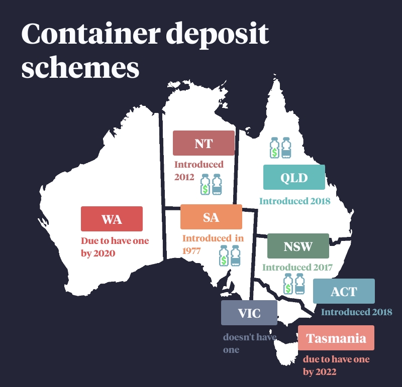 South Australia set up the nation’s first scheme in 1977, followed by the Northern Territory in 2012, New South Wales in 2017 and the ACT and Queensland in 2018.