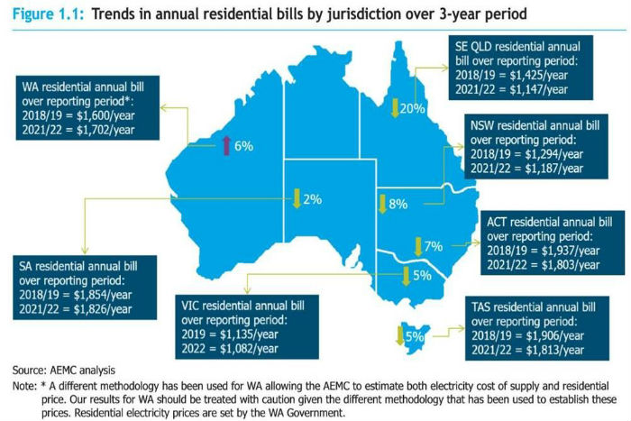 The Australian Energy Market Commission (AEMC) has projected cheaper household electricity bills in every state except Western Australia.