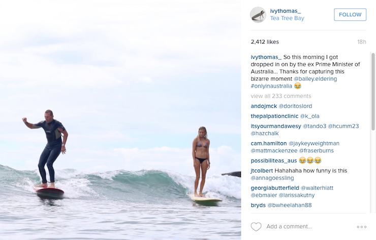 Gold Coast teenager Ivy Thomas was quietly minding her own business while surfing at Noosa’s Tea Tree Bay when she spotted Mr Abbott hanging ten beside her.