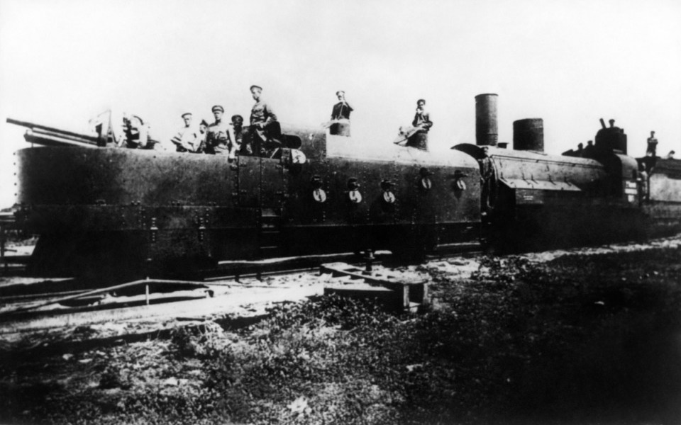 A photo taken during the Russian civil war in Tsaritsyn (Volgograd and Stalingrad) of the armoured train of the Second Siberian Red Army.