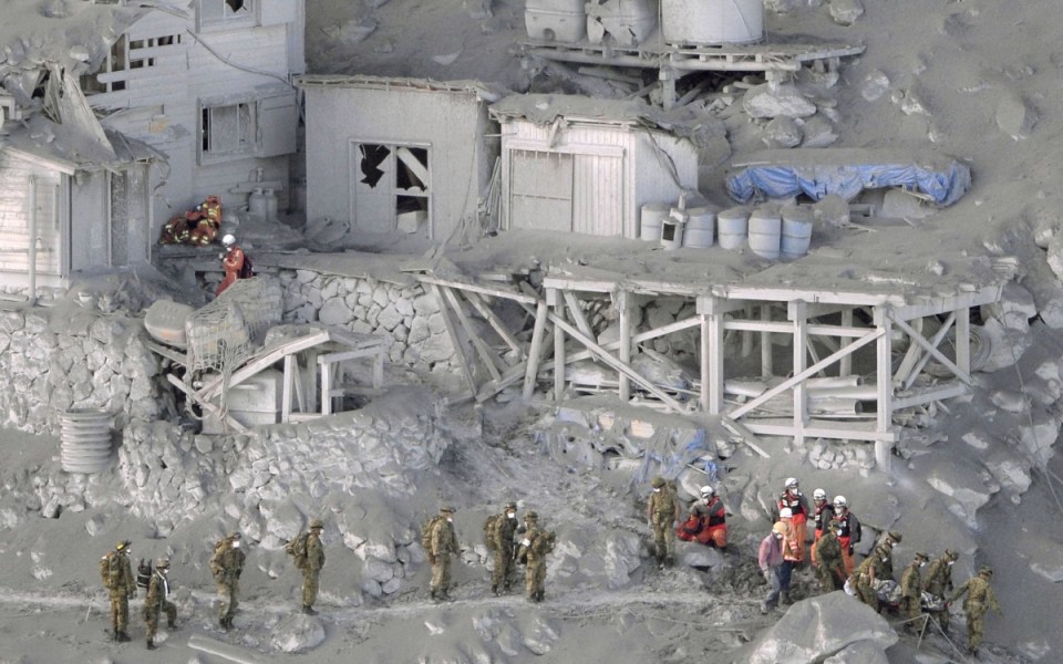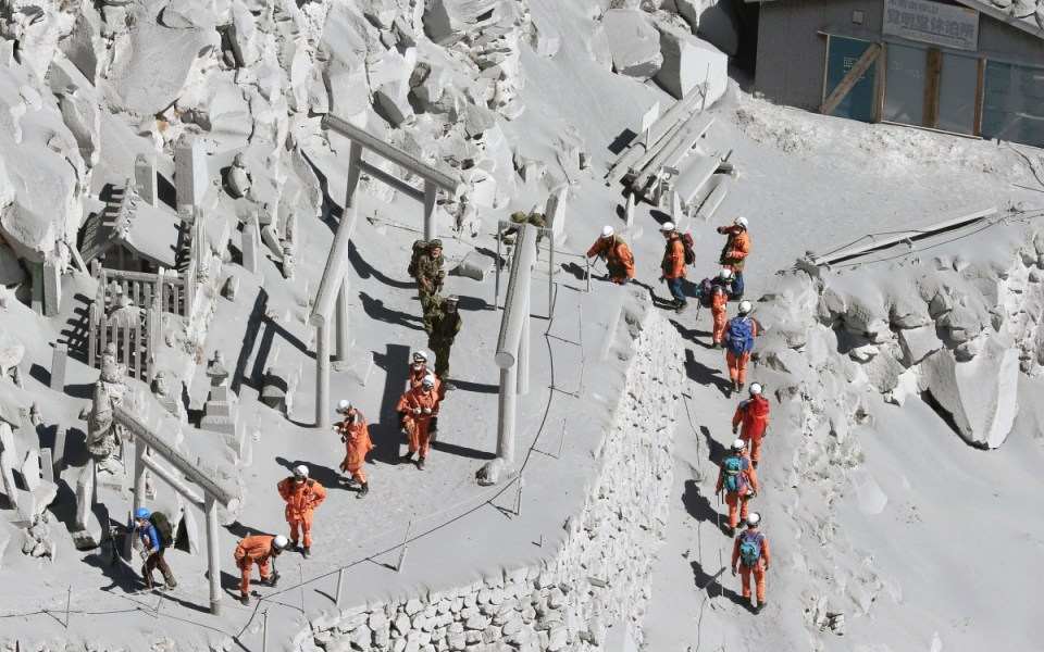 Firefighters and Self-Defence Forces members conduct rescue operations at a lodge near the ash-covered summit.