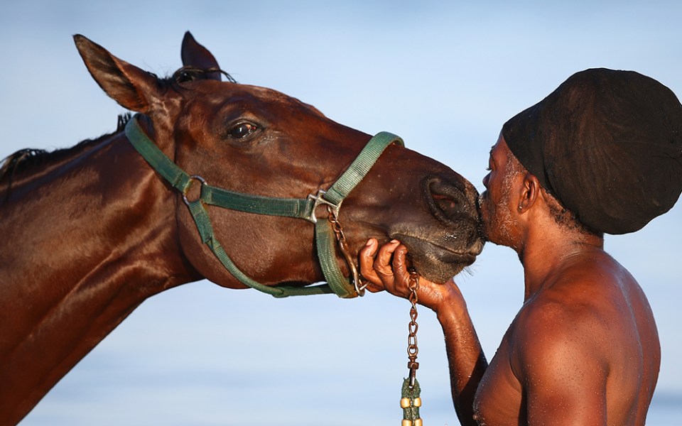 A race horse in Barbados being taken to the sea for aerobic exercise and recovery for sore muscles.