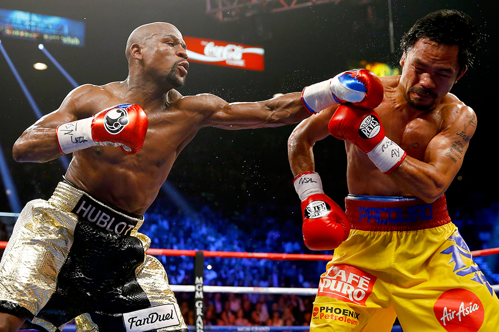 Floyd Mayweather lays a punch on Manny Pacquiao during one the most anticipated boxing matches ever.