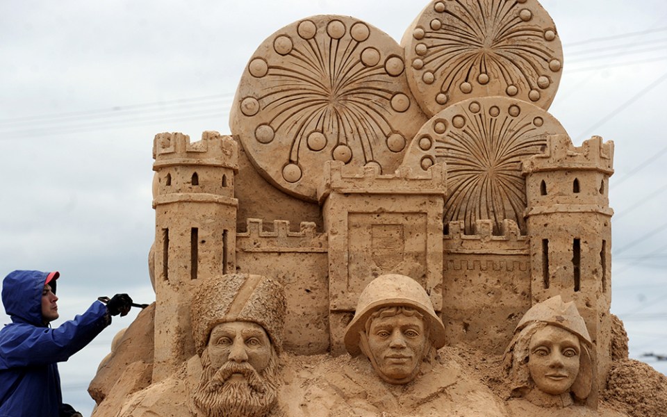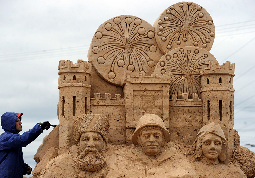 A sculptor makes a sand sculpture devoted to the WWII battle for Minsk ahead of celebrations marking the end of WWII.