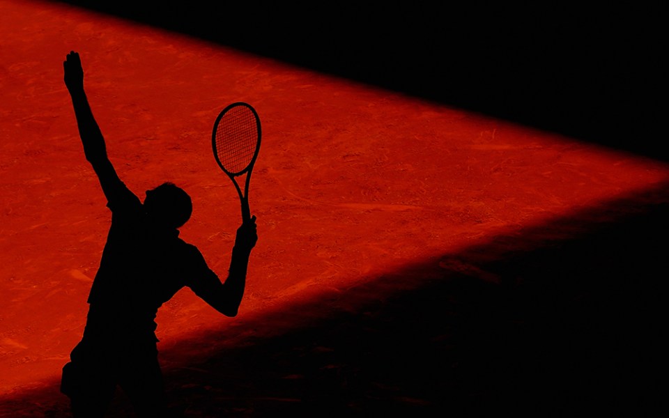 Grigor Dimitrov of Bulgaria serving to Fabio Fognini of Italy during the Mutua Madrid Open tennis tournament at the Caja Magica, Spain.