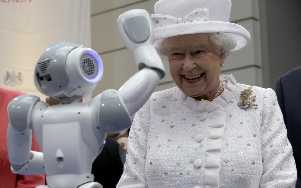 Queen Elizabeth II smiles as a little robot waves to her during a reception at the 'Technische Universitaet' (Technical University) in Berlin, Germany.