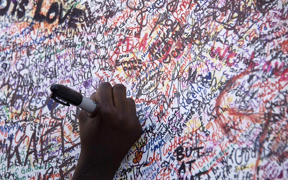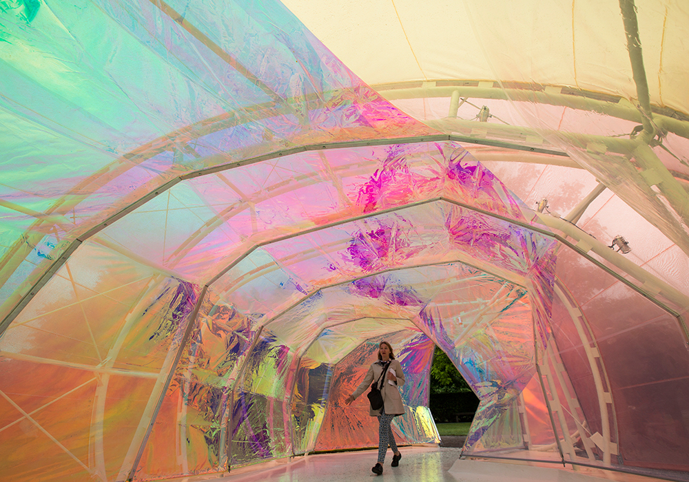 People walk on a brightly covered carpet on London Bridge, part of an art project transforming landmarks around the world.