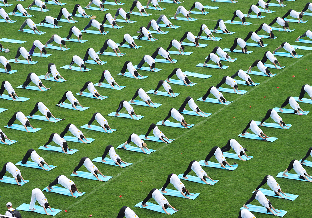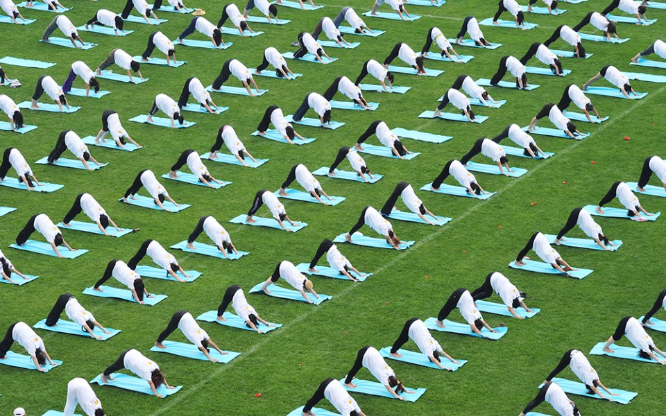 Students in China take part in a mass yoga session for the first International Day of Yoga.